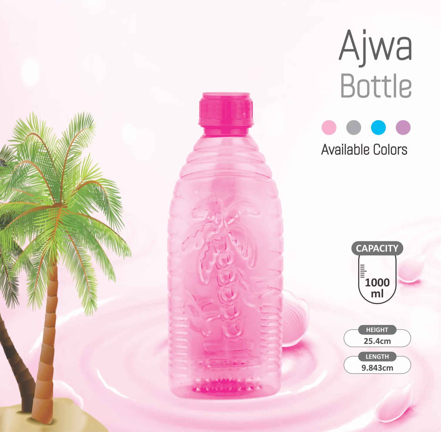The Ajwa Bottle is a beautifully designed water bottle, featuring an intricate palm tree pattern that brings a touch of nature to your daily hydration routine. With a 1000 ml capacity, this bottle is perfect for staying hydrated throughout the day. Its stylish and functional design makes it suitable for both indoor and outdoor use, whether you’re at home, work, or the gym. The secure plastic cap ensures a leak-proof seal, making it ideal for on-the-go use. Available in pink, blue, purple, and gray, the Ajwa Bottle combines functionality with a unique design, making it an excellent choice for those looking for both style and practicality.