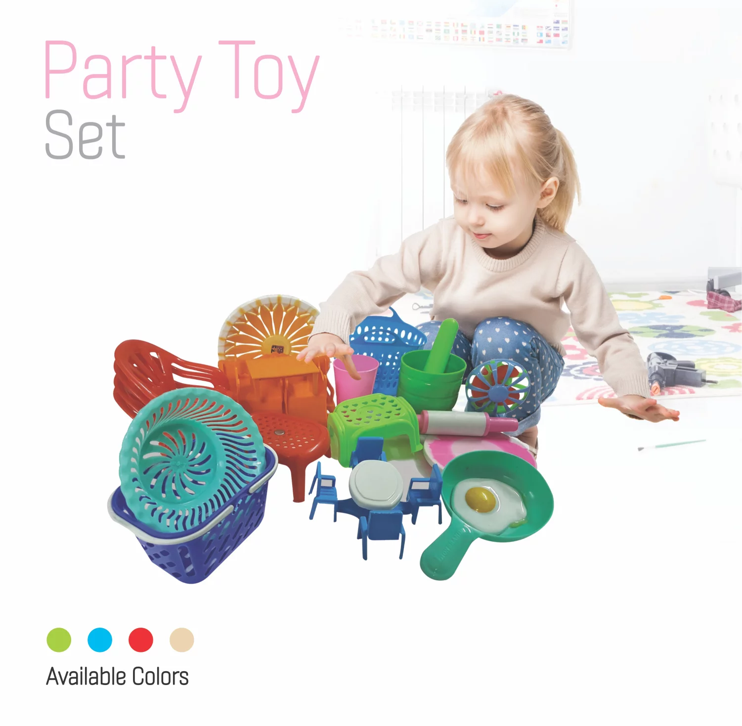 The Party Toy Set is a vibrant and engaging playset designed to inspire creativity and role-playing for children. This set includes various fun items like toy dishes, baskets, cups, and more, making it perfect for pretend tea parties, cooking, or playdates with friends. Made from child-safe, durable plastic, each item is designed to withstand hours of playtime while being easy for little hands to handle. Available in green, blue, red, and beige, this set encourages imaginative play and is ideal for fostering social interaction and fine motor skills.