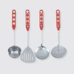 - Set includes a solid ladle, slotted spatula, round ladle, and skimmer.