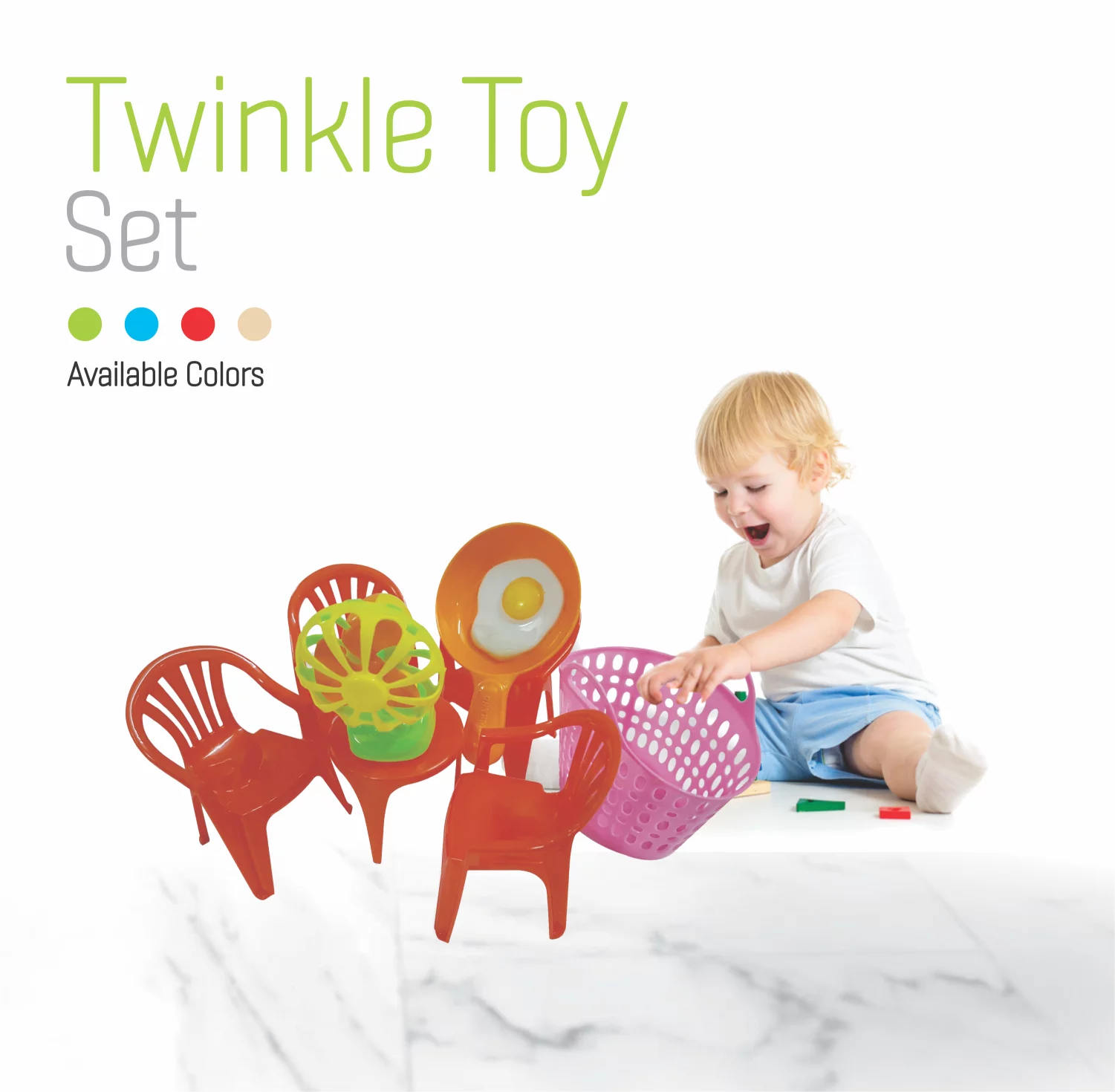 The Twinkle Toy Set is an exciting collection of toys designed to spark creativity and role-playing in children. This set features miniature chairs, kitchen items, and more, perfect for pretend play scenarios like tea parties or kitchen setups. Each piece is crafted from child-safe, durable plastic, ensuring it can withstand active play. The lightweight design makes it easy for children to handle, rearrange, and incorporate into various imaginative games. Available in green, blue, red, and beige, the Twinkle Toy Set brings color and fun to every playroom, encouraging social interaction and creative development.